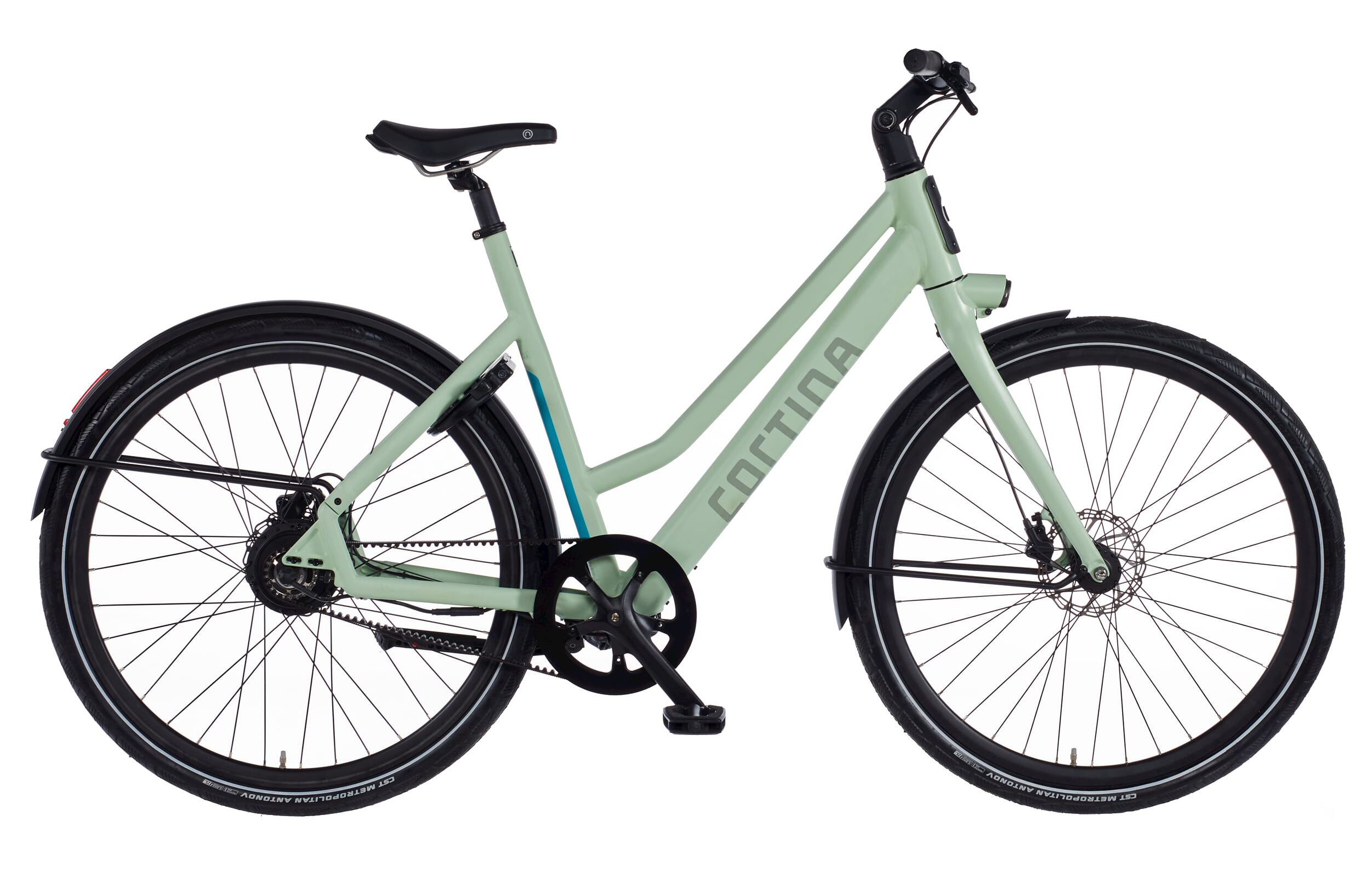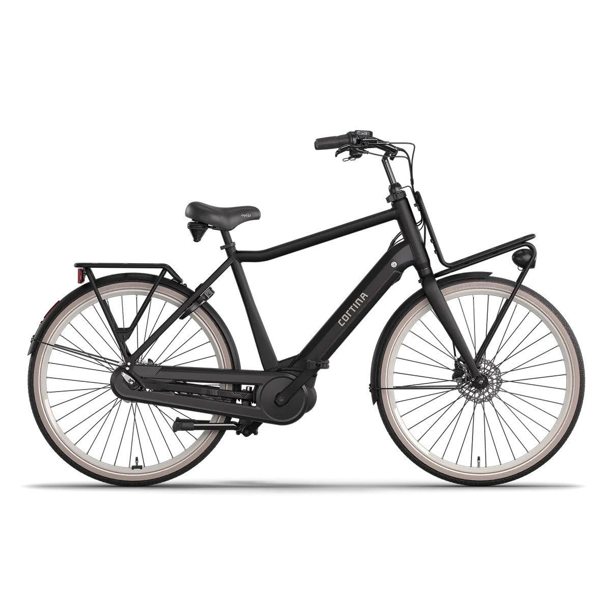 Cortina elektrische fiets Common. Uitgerust met een Shimano Nexus 7 versnellingsnaaf, rollerbrakes voor en achter, Bosch ActiveLine systeem met middenmotor, wordt geleverd met 300Wh / 36V Bosch accu.